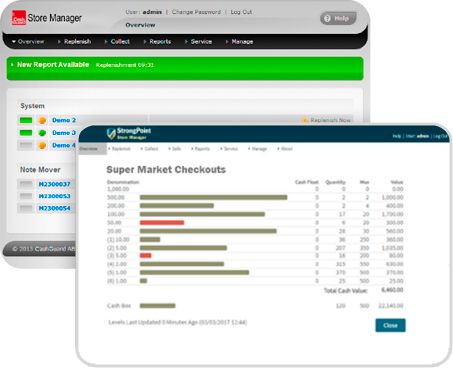 Store Manager optimiza los niveles de cada denominación compensando el cambio atendiendo a los niveles del fondo de caja. Además, proporciona informes sobre el flujo de caja y propone mejoras de uso basadas en los reportes.